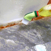 Det platta, smala borsthuvudet och de styva nylonborsten kommer åt i fogar och hörn och tar bort intorkade tvålrester och smuts. Den inbyggda skrapkanten tar sig igenom envis olja och rester utan att skada ytorna.